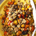 Pour this mixture over the dry ingredients and mix well, ensuring everything is well coated and there are no dry spices left in the bottom of the bowl.